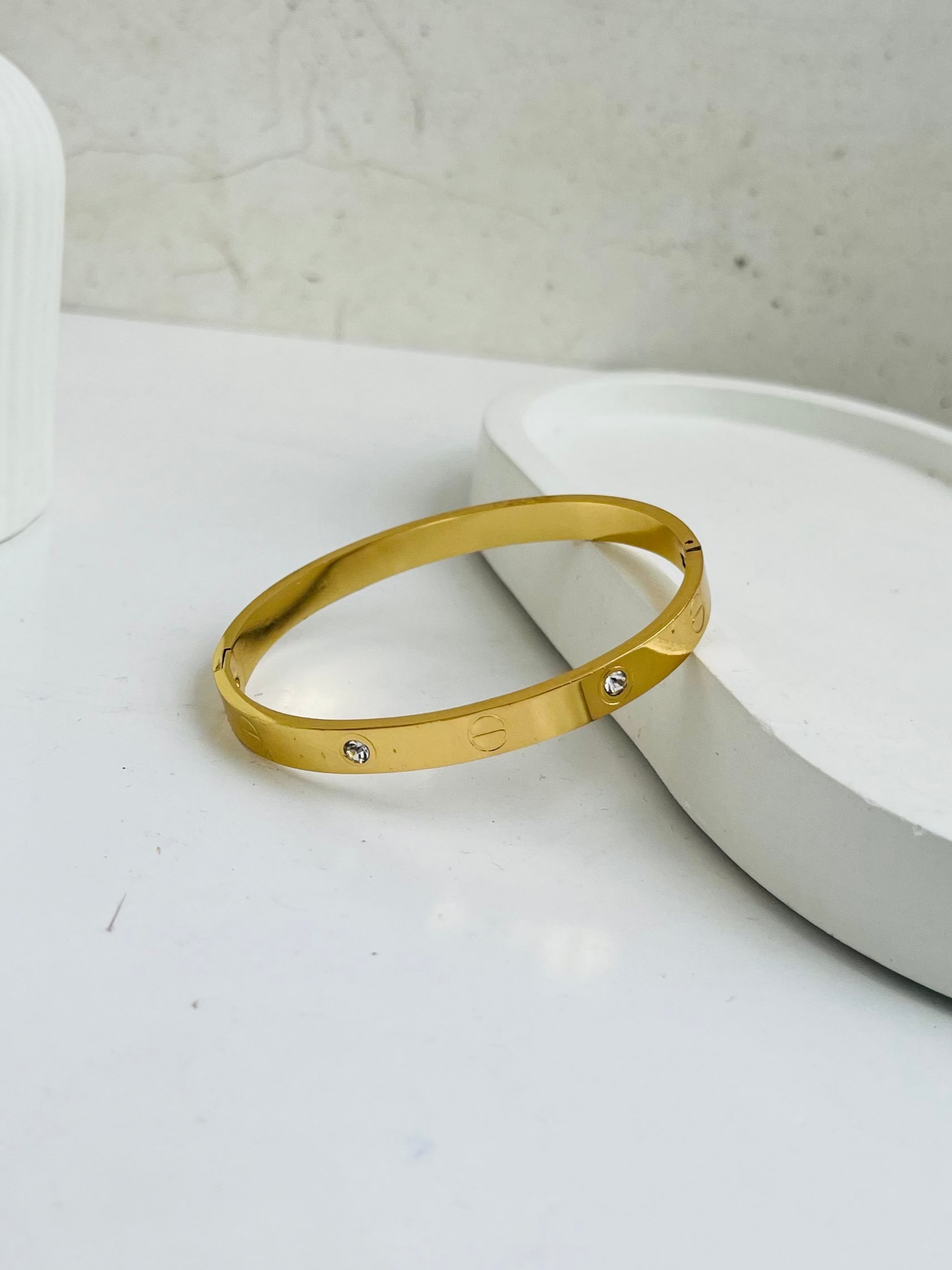 This simple yet stylish bracelet is perfect for daily wear. Its lightweight design ensures comfort, while the small, brilliant stones add a beautiful and subtle sparkle. This golden-colored bracelet pairs easily with any outfit, from casual to formal.