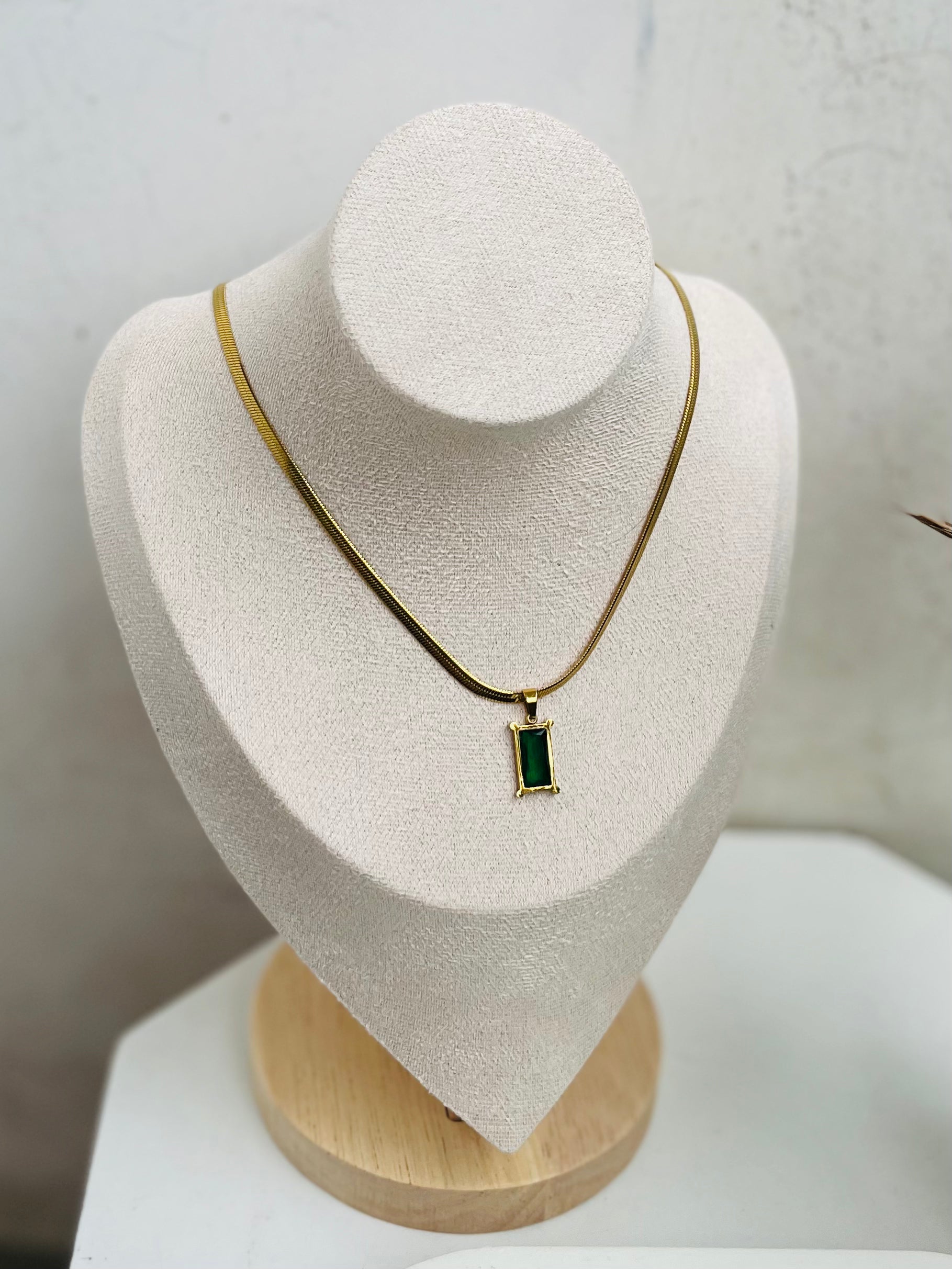 Add a touch of timeless luxury with this emerald green pendant necklace. Featuring a rectangular gemstone in a gold-plated frame on a sleek snake chain, it's perfect for elegant evening wear or everyday sophistication. Ideal for gemstone jewelry lovers, this statement necklace brings vibrant charm to any outfit. A must-have accessory in gold fashion jewelry collections.