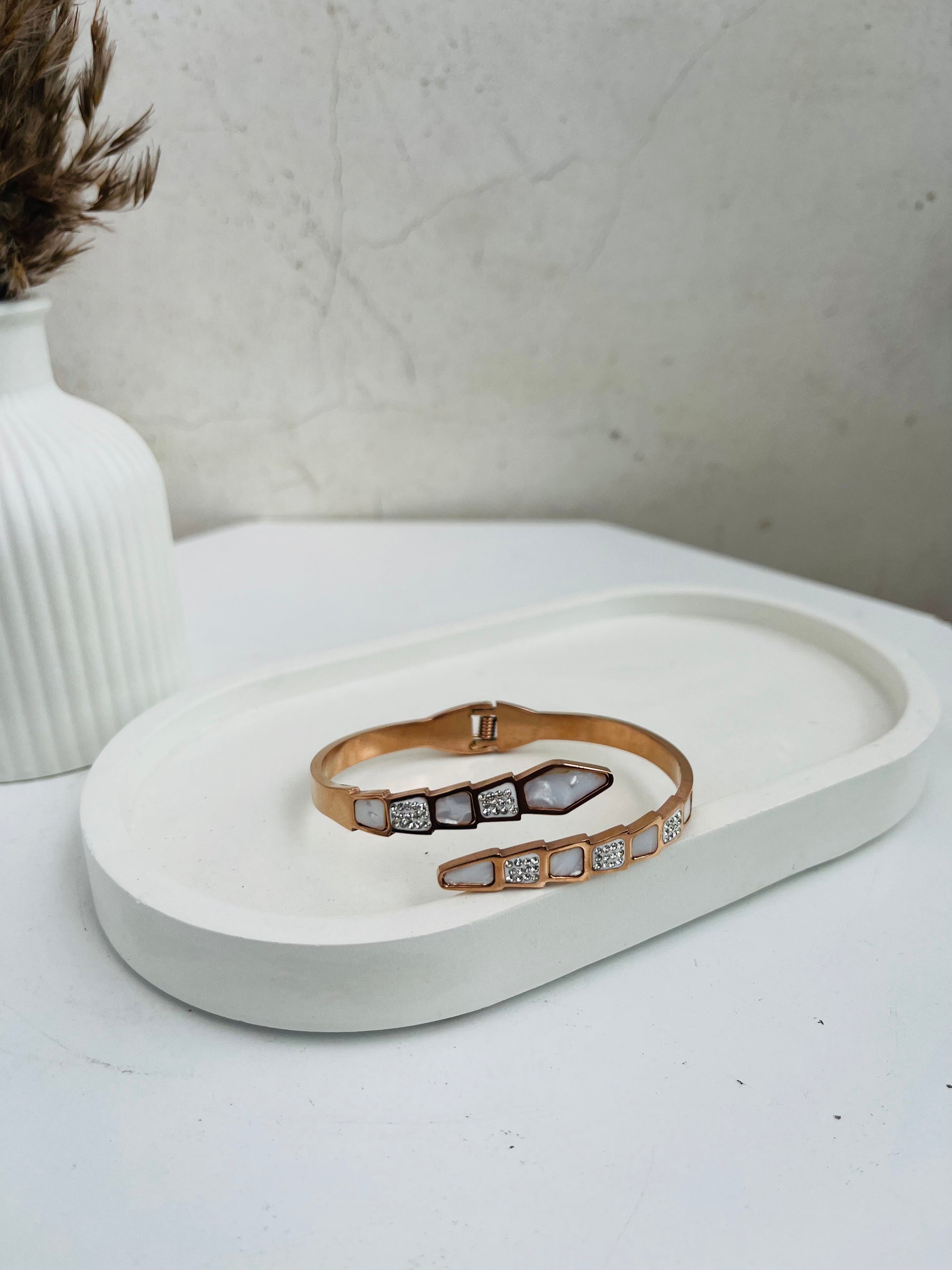 A stunning rose gold bracelet with an open cuff design. It is embellished with sections of iridescent mother-of-pearl and lines of dazzling crystals, creating a luxurious and eye-catching look.